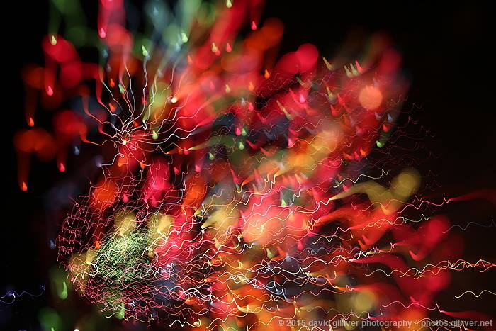 My lens choice for shooting fireworks had now changed: whereas previously I’d shot with wide (eg. 17mm or 24mm) lenses to capture the whole fireworks scene, now I was shooting with a telephoto lens around 100mm. I was deliberately placing myself as close to the fireworks as practical so that I could shoot up and ensure I didn’t get any background objects (buildings, etc) in the shot. The goal was to keep things abstract and weird.